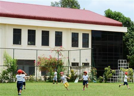 ミャンマーの最大都市ヤンゴンにある日本人学校の新校舎。手前は校庭で遊ぶ幼稚部の児童ら=2015年5月(共同)
