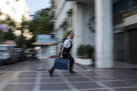 6月28日、現金自動預払機(ATM)に紙幣を補充するため、首都アテネの銀行前でダッシュする警備員。デフォルトの可能性が高まったギリシャではこの日、多くの預金者たちが口座の凍結を懸念してATMで現金を引き出し、各地のATMで紙幣が不足する事態となった=2015年(ロイター)