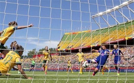 後半、CKからのこぼれ球に反応して、値千金のゴールを決める岩渕真奈(まな、右から2人目)=2015年6月27日、カナダ・アルバータ州エドモントン(AP)