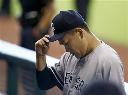五回を投げ終え、険しい表情でベンチに戻るヤンキース・田中将大(まさひろ)=2015年6月27日、米テキサス州ヒューストン(共同)