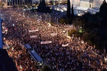 6月29日、ギリシャ・首都アテネの集会に参加した人々=2015年(ゲッティ=共同)
