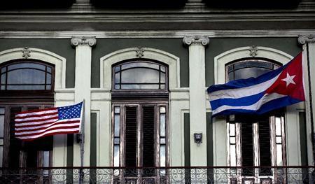 キューバの首都ハバナのホテルのバルコニーに翻るキューバと米国の国旗。半世紀ぶりに両国の国交が回復する=2015年1月19日(AP)