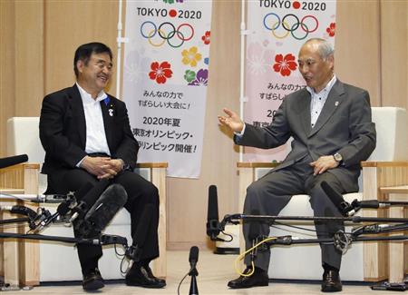 新国立競技場の建設費用の負担をめぐり、東京都の舛添(ますぞえ)要一知事(右)と会談する遠藤利明五輪相=2016年7月8日午後、東京都新宿区・東京都庁(共同)