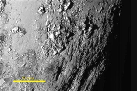 探査機ニューホライズンズが7月14日に撮影した冥王星の地表。高さ約3500メートルもの山々(中央)が集まり、近くにクレーターのない平地が広がっている(左下のスケールは約80キロ、NASA提供・共同)