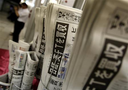 英紙フィナンシャル・タイムズを買収する日本経済新聞社のフロントページ=2015年7月24日、東京都内の販売店(ロイター)