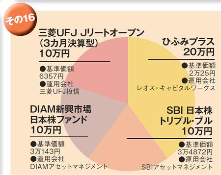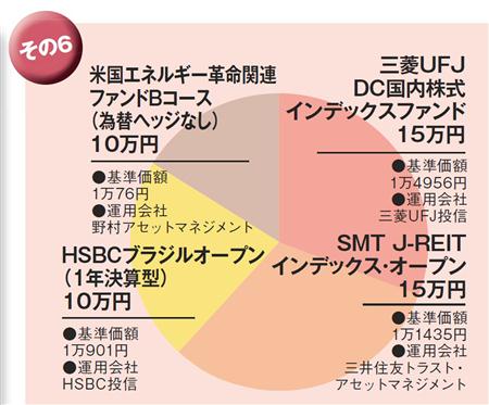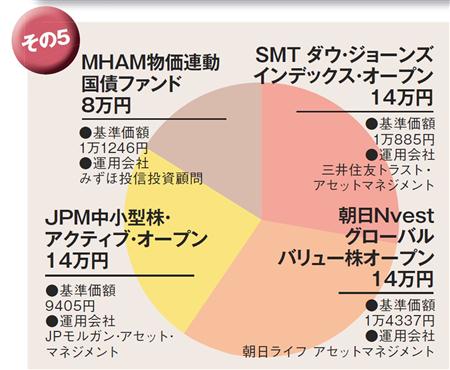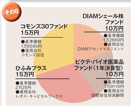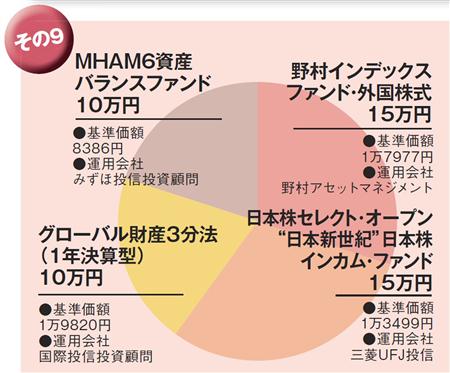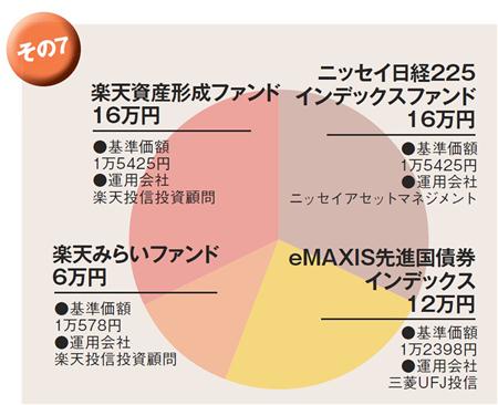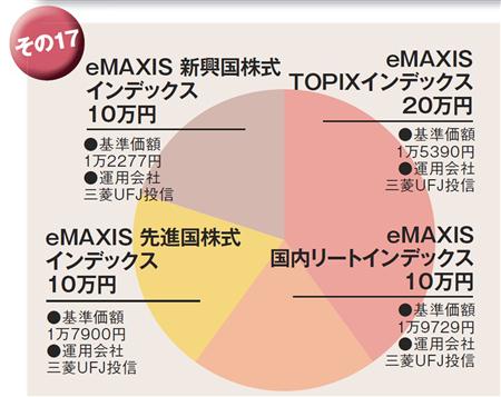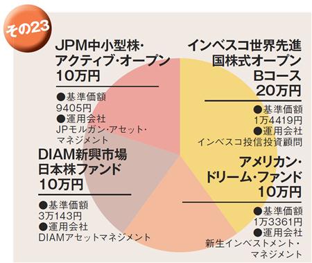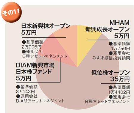 また、収益は非課税というメリットに注目して、リスクはあっても大きな収益が見込める新興株に投資するタイプも勧める。その際、プロの「目利き」を存分に享受できるアクティブ運用タイプを推すため、少しでもリスク分散を図るべく、「DIAM新興市場日本株ファンド」「日本新興株オープン」「MHAM新興成長株オープン」と、3本のファンドに分散した。