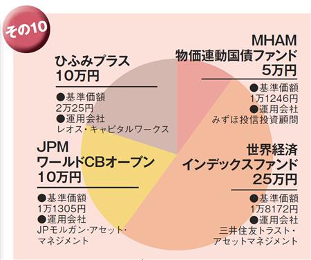 また、アベノミクスの成否いかんにかかわらず物価上昇は進展するであろうことから「物価連動国債ファンド」を選んだ。次に投信ならではのアクティブ運用ファンドを。世界的な高齢化や新興国の人口増を受けヘルスケア・バイオ関連分野は今後も期待大。インベスコは比較的高コストだがブランド力のある企業は不況にも強い安定感が強みがあるので組み入れた。