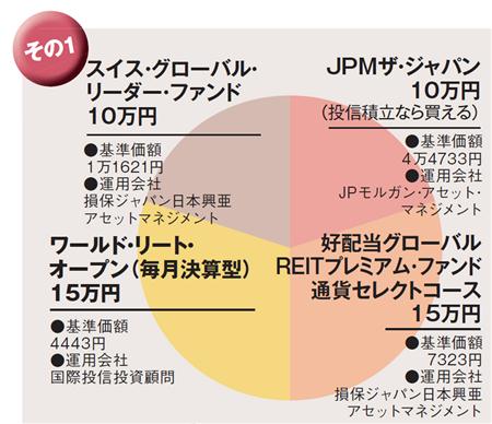 カブドットコム証券の投信ラインアップから4本を選択した。円安が進む場面を想定して、「好配当グローバルREITプレミアム・ファンド通貨セレクトコース」はユーロを選択。50万円のうち15万円を投入。「ワールド・リート・オープン(毎月分配型)」にも15万円投入。