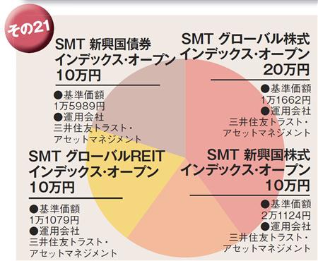 今回選んだSMTインデックスシリーズは、取扱窓口が比較的多く、ノーロードで運用管理費用も安い。基本の4資産(国内株式、国内債券、外国株式、外国債券)に分散し、リスクの分散を図る。