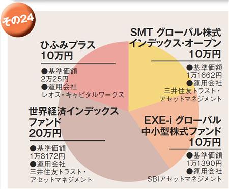 選んだファンドは、日経平均株価に連動したもの、日本株式を除く世界の主要国の株式を投資対象としたもの、世界各国の転換社債を中心に投資する、東証REIT指数をベンチマークとしたものの4本だ。この4ファンドに1万円ずつ計4万円を毎月購入することにより長期投資、分散投資が可能となる。