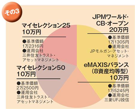 口座の特性を生かして、自動的にリバランスができるバランス型投信、運用の効率性を高める決算回数の少ない投信を選択。「JPMワールド・CB・オープン」は世界のCB(転換社債)が投資対象。為替ヘッジをしており、高コストだがリスクに対して高リターンだ。「eMAXISバランス(8資産均等型)」は株・債券・REIT(不動産投信)の8資産に均等配分。「マイセレクション50」「マイセレクション25」は、株と債券が投資対象だが「50」のほうが株式比率が高い。コストが低く、リスク・リターンの水準が異なるバランス型投信を組み合わせて投資をすることで、ずっと保有し続けても安心。