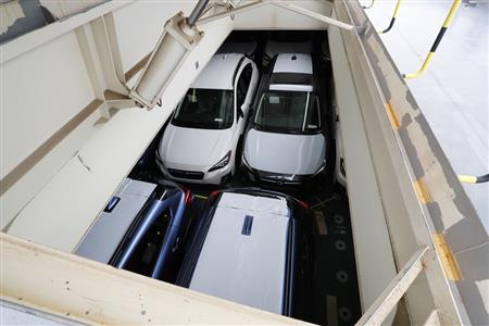 最大積載台数は、乗用車ならば4900台。デッキは天井高2.10m前後で、12階建ての積層だ、そんな巨大な船のリアゲートが開けられ、ポートに並べられていたまっさらな輸出モデルが次々と積み込まれていくのである。