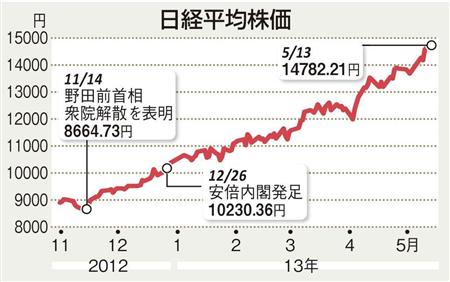 昨年11月14日に野田佳彦前首相が衆院解散を表明したことを契機に、政権交代や日銀の金融緩和強化の期待から円安と株高が加速した「安倍相場」が始まってから半年がたった。この間円相場は3割近く下落し、日経平均株価は約7割上昇した。こうしたなか、金融市場では、株などのリスク資産への大規模な資金移動を指す「グレート・ローテーション(大転換)」への期待も高まっている。