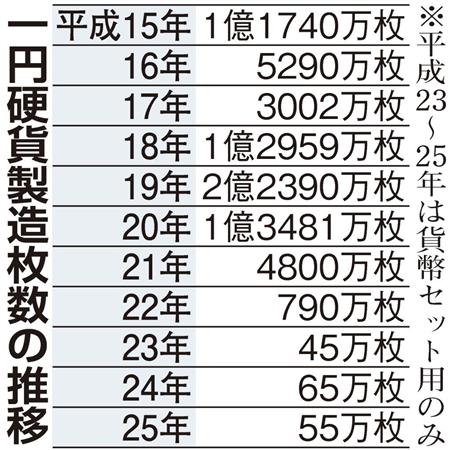 ただ、製造は何度も壁にぶつかってきた。平成元年の消費税導入当初は深刻な一円玉不足に陥り、月3億枚ペースで発注があったというが、その後は減少。電子マネーの普及もあり、ここ3年は貨幣セット用だけで、一般流通向けの製造はなかった。