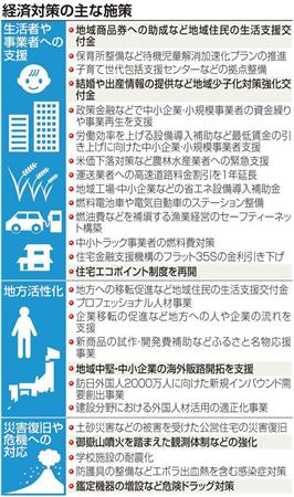 焦点は今後、掲げられた政策の具体化に移る。たとえば自治体が使い途を自由に決められる交付金などは柔軟性に富む一方、地域ごとに効果や進捗(しんちょく)にばらつきが生じる可能性もある。看板倒れに終わらないためにも、政府のきめ細かなサポートは欠かせない。