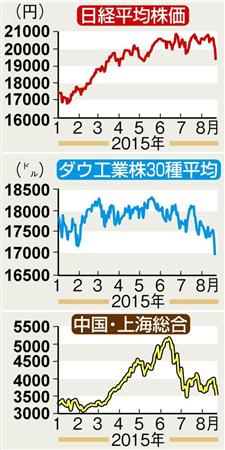 更新21日の東京株式市場は、中国を「震源地」とする世界景気の失速懸念を受けて売り注文が殺到し、日経平均株価の終値は前日比597円69銭安の1万9435円83銭だった。下げ幅は7月8日(638円)に次ぐ今年2番目の大きさ。欧米株やアジア株も軒並み売られ、「中国発の世界同時株安」(甘利明経済再生担当相)の様相を呈してきた。