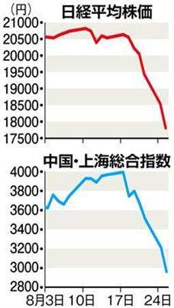 更新株安の連鎖がなお続いている。25日の中国・上海株式市場は、中国経済の先行き懸念などから代表的な指数である総合指数が大幅続落し、前日比7.63%安の2964.97で取引を終えた。終値が3000の大台を割り込んだのは昨年12月24日以来で約8カ月ぶりの安値水準。東京株式市場では日経平均株価が乱高下し、第2次安倍晋三政権発足以降で初めてとなる6営業日続落となった。世界同時株安の震源地である中国経済の失速懸念は払拭されておらず、市場の動揺は今後も続く可能性がある。