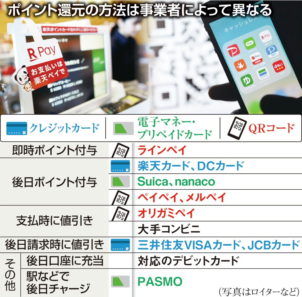 増税後の消費の落ち込みを防ぐため、キャッシュレス決済に伴うポイント還元も始まる。中小店舗で現金を使わずに買い物をすれば、5%分がポイントなどで戻ってくる制度だが、大手企業ではポイントが付かず、大手企業のフランチャイズ加盟店では2%と、店舗の規模によって還元率が異なるなど、分かりにくいとの指摘も多い。