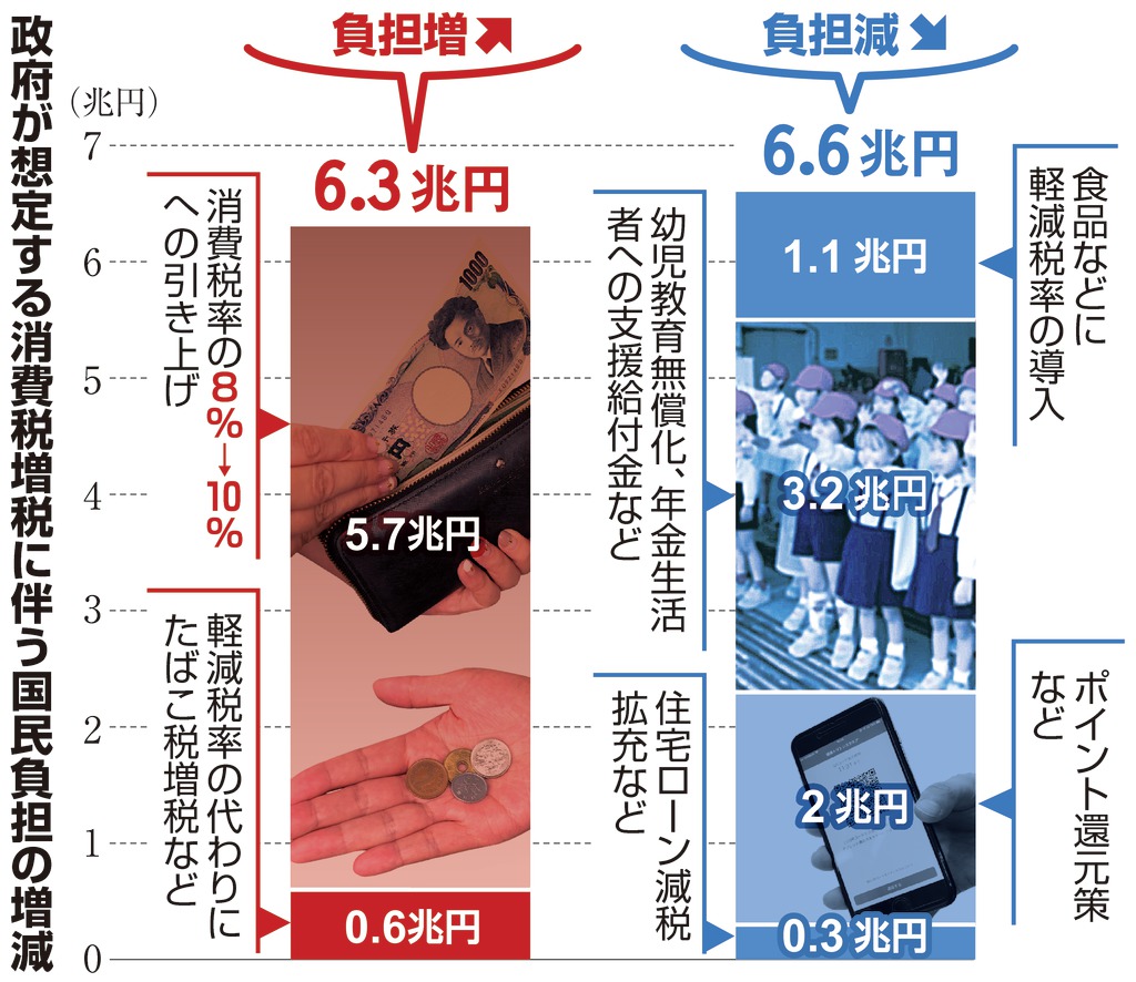 1日からは増税で増える税収の一部を活用し、幼児教育・保育の無償化や低所得の高齢者を対象に最大月5000円(年6万円)が支給される「年金生活者支援給付金制度」も始まる。増税で見込まれている税収増は年間約4.6兆円。このうち約2.8兆円を教育無償化など社会保障の充実に充て、残りの約1.8兆円は財政再建に回す。
