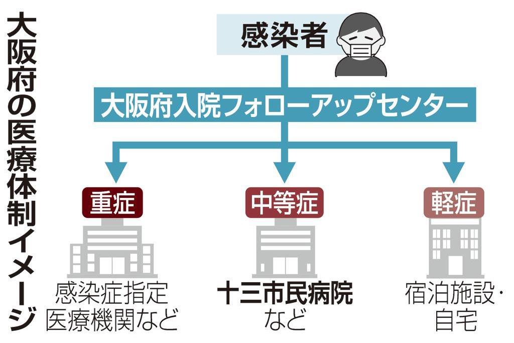 中等症と重症患者が入院している大阪府内の医療機関の一部では、感染者が増え満床が近づいている。大阪市内で感染者を受け入れているある病院の関係者は「十三市民病院が中等症患者を受け入れてくれればありがたい」とする。