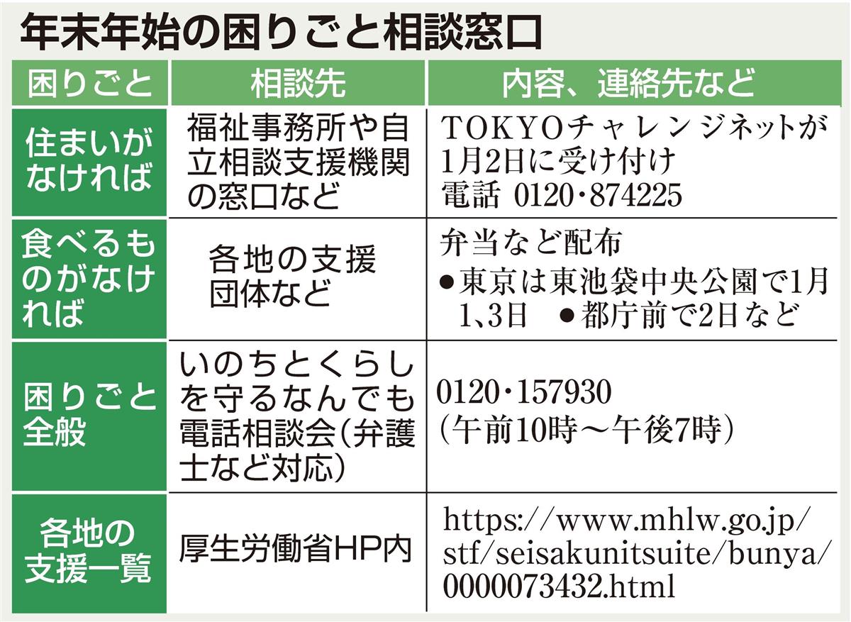 新型コロナウイルス禍は、多くの働く人々から仕事や住まいを奪っている。厚生労働省によると、新型コロナ関連の解雇や雇い止めは約8万人に上る。行政窓口が閉まる年末年始は公的支援を受けられない恐れもあるとして、民間団体らによるサポートが各地で行われているが、相談者らは「会社の寮を追われた」「パートでは貯蓄ができない」などと悲痛な声を上げた。
