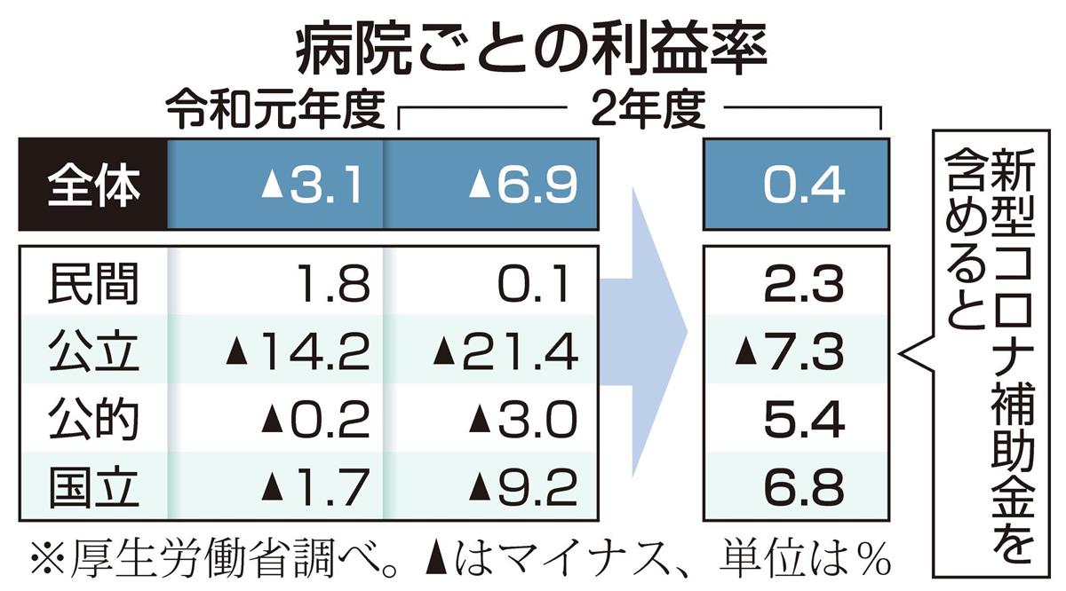 調査結果によると、一般病院の利益率はマイナス6・9%となり元年度に比べ悪化した。厚労省の担当者は「感染拡大で受診件数や手術件数が減っている影響が大きい」と分析。コロナ関連の補助金を含めると0・4%の黒字になるが、後藤茂之厚労相は24日の記者会見で「黒字は非常にわずか」との認識を示した。