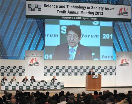 STSフォーラムであいさつする安倍晋三首相=6日、京都市左京区