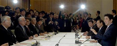 政労使会議であいさつする安倍晋三首相(右)。左から米倉弘昌経団連会長、古賀伸明連合会長ら=20日午後、首相官邸
