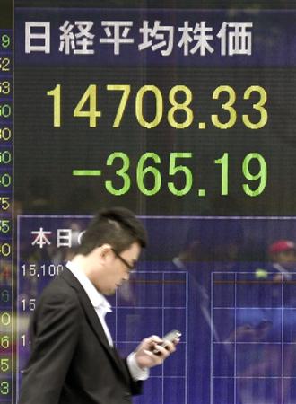 東京株、400円超の大幅下落で1万4700円割る 世界同時株安に