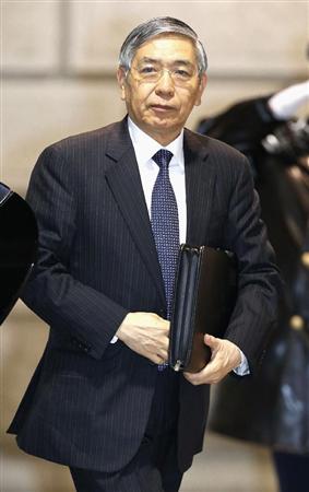 金融政策決定会合が開かれる日銀本店に入る黒田総裁=18日午前