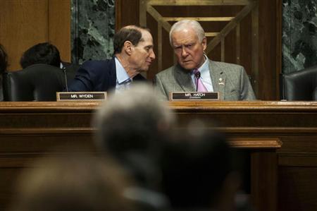 16日、米ワシントンで、言葉を交わす共和党のハッチ上院財政委員長(右)と民主党のワイデン筆頭理事(ゲッティ=共同)