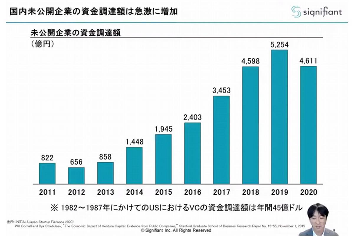 朝倉さん「日本のスタートアップ資金調達額は、2012年から右肩上がりとなっています。1982~1987年における米国のスタートアップ資金調達額は年間45億ドルなので、ようやく日本もその水準に追いついてきました。産業を牽引するスタートアップを創出するためには、起業家の絶対数を増やすほか、M&AやIPO後に継続成長するための支援も必要です。マザーズの新規上場数も増えている一方で、上場時に高騰した初値を株価が上回らないことも多い。なぜならアセットクラスの都合上、IPO後もVCが継続支援することは難しいうえに、長期保有を前提とする機関投資家の投資対象にならない水準の時価総額規模に留まる会社が多いからです。結果、目先の株価や業績の上がり下がりばかりに目が向きがちな投資家が集まりがちになります。中長期の視点がないため、スタートアップが思い切った投資や挑戦をしづらく、新産業創出のボトルネックになってしまう可能性があります」
