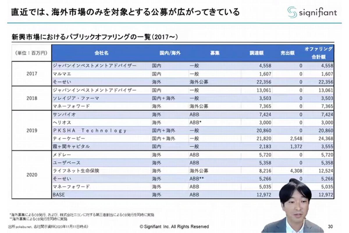 Post-IPO後の資金調達に関する難しさが語られる中、朝倉さんは「一方で、状況は変化しつつある」と強調します。東証マザーズにおけるパブリックオファリング(公募増資)は2017年に3件だったものの、2020年には6件と倍増していることを挙げます。