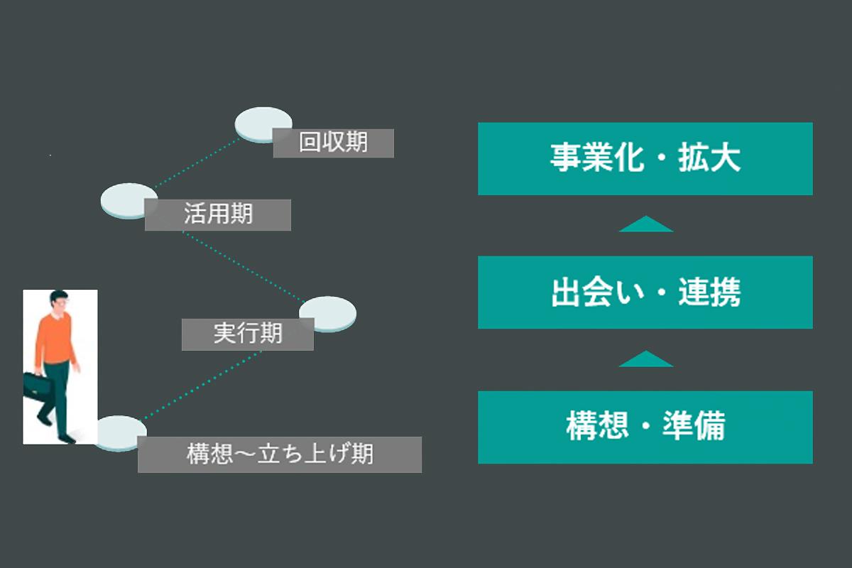 “ある程度泳げるようになっているかどうか”が重要で、この状態までが実は構想・準備期だ。オープンイノベーションという手段で成果に結びつけられるかどうかはこの構想・準備期が80%を握っていると考えている。