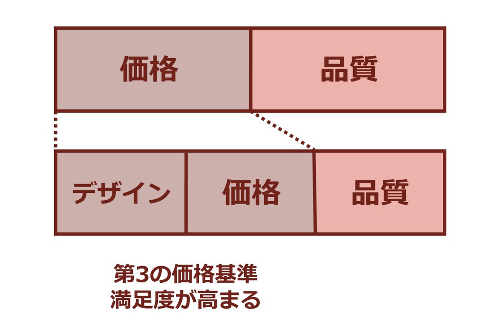 ZARAはそこに「トレンド」という第3の軸を意識させることに成功しました。「品質」「価格」「トレンド(デザイン)」という3つの評価軸のうち、「価格」と「トレンド(デザイン)」を満たしていることをアピールしたのです。そうすることで、満足度が高まったと印象付けることができているのです。