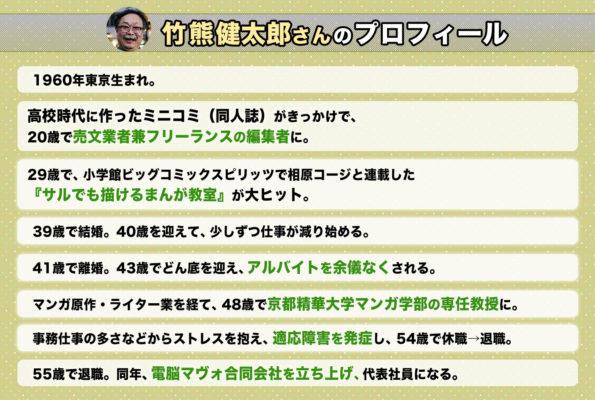 中西:竹熊さんといえば、大ヒットした『サルでも描けるまんが教室』の作者として、またオンライン漫画誌『電脳マヴォ』の編集長としてご存知の方もいるかもしれません。まずは読者の皆さんのために、竹熊さんの経歴をざっとまとめてみました。