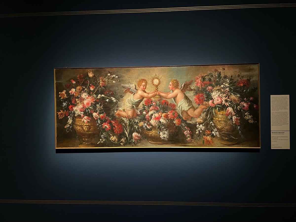 エリザベッタ・マルキオーニの17世紀末の以下の作品にみるように、こんなに花に囲まれた宗教的テーマの絵が、男性画家による作品であるのだろうかとも思った。