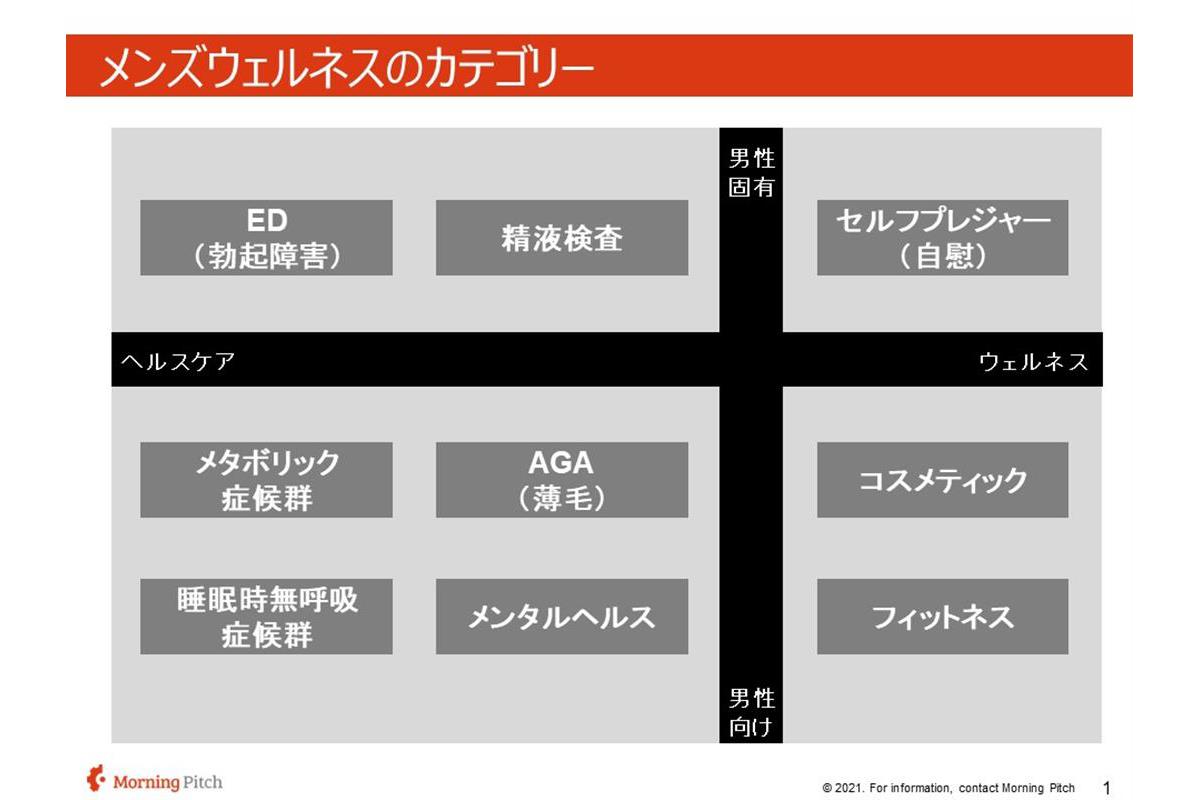 Femtechはデジタル時代のライフスタイルや価値観をAIなどのテクノロジーの力を借りて再設計したヘルスケア・ウェルネスのソリューション群のことを指します。これを参考にしてメンズウェルネスのカテゴリーについては、ED(勃起障害)、精液検査、セルフプレジャー(自慰)、メタボリックシンドローム、AGA(薄毛)、コスメティック、睡眠時無呼吸症候群、メンタルヘルス、フィットネスに分類しました。「ヘルスケア」は疾患で、「ウェルネス」はより良い人生を送るために存在するものだと位置付けています。取り扱う領域は男性固有か男性向け(女性より男性に発症しやすい悩みへのソリューション)に限定しました。