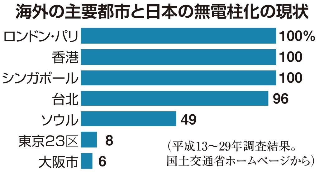 国交省によると、パリや香港、ロンドン、シンガポールといった主要都市の無電柱化は軒並み100%。台湾の台北も96%と高水準だが、大阪市は6%で、東京23区でもわずか8%(国内の数値は平成29年度末の国交省調べ)にとどまる。