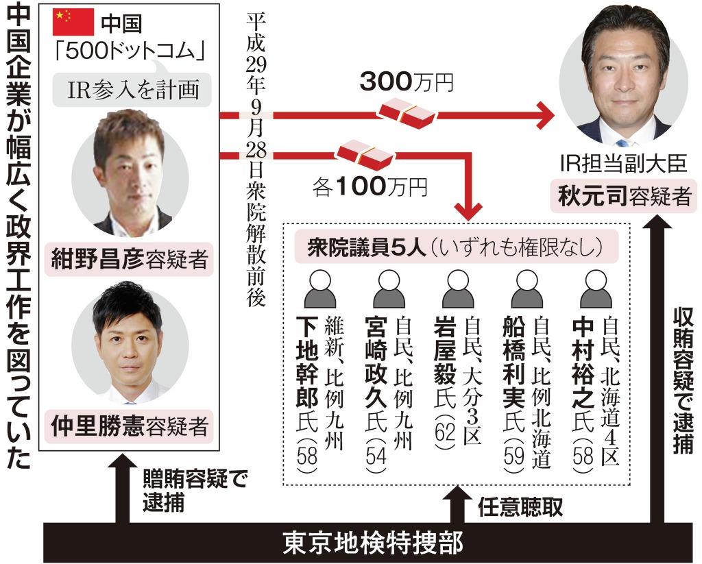 カジノを含む統合型リゾート施設(IR)事業をめぐる汚職事件では、贈賄容疑で逮捕された中国企業側が、IR担当の内閣府副大臣だった衆院議員、秋元司容疑者(48)=収賄容疑で逮捕=以外にも衆院議員5人に現金100万円ずつ提供するなど、幅広く政界工作を図っていた実態が明らかになってきた。5人はIR担当副大臣だった秋元容疑者と異なり、IRに関して職務権限がないため収賄罪に問われる可能性は低いとみられるが、政治資金規正法違反などに該当する恐れはありそうだ。