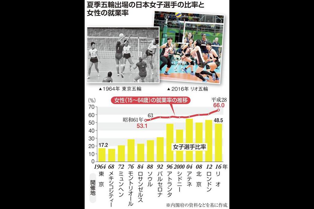 前回の東京五輪に参加した日本代表選手は355人。内訳は男子294人、女子はわずか61人。「男は働いて家計を支え、女は家事や育児を担う」という時代の空気を反映していた。