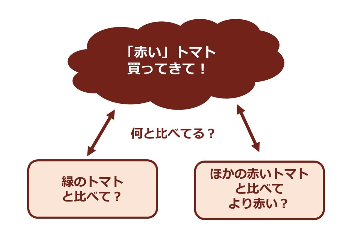ロジカルシンキングの「ロジカル」とは論理、つまりルールです。ルールに従って考えたり、発言することによって、なるべく共通のイメージを持って話を進めることができるようになるというものです。ですので、発話する場合には「比較対象を共有する」ことが大事であり、聞く側も「比較対象を確認する」ことが必要になります。