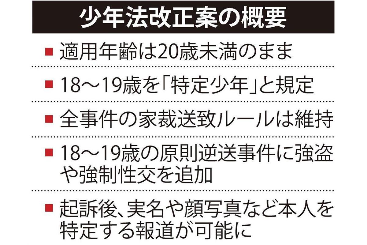法務省では答申後に改正案を検討し、20歳未満を現行通り少年と扱いつつ、18~19歳は特定少年と呼ぶことにして新たな条文を整備。答申に沿い、18~19歳が原則逆送となる事件には、殺人など「故意の犯罪行為により被害者を死亡させた罪」のほか、強盗や強制性交など「法定刑の下限が1年以上の懲役・禁錮に当たる罪」を追加した。起訴されて公開の場で裁判が開かれることが決まれば、氏名や顔写真など本人を特定する報道も可能とした。