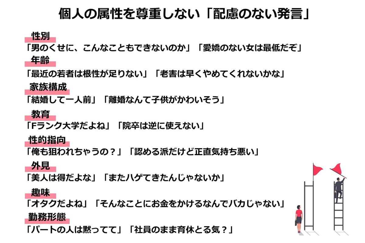 ダイバーシティというと性別、年齢、人種、障害の有無などだけを指すものだと思う人は多いと思います。ダイバーシティは、個人の持つあらゆる属性を指していますので、住んでいる場所、家族構成、教育、性的指向、外見、趣味、出身地、体格、勤務形態なども含まれます。そう考えると、配慮は特定の人だけではなく、組織の全員に必要だということがおわかりいただけると思います。具体的にどんな発言がNGなのか、具体例を見ながら確認しておきましょう。