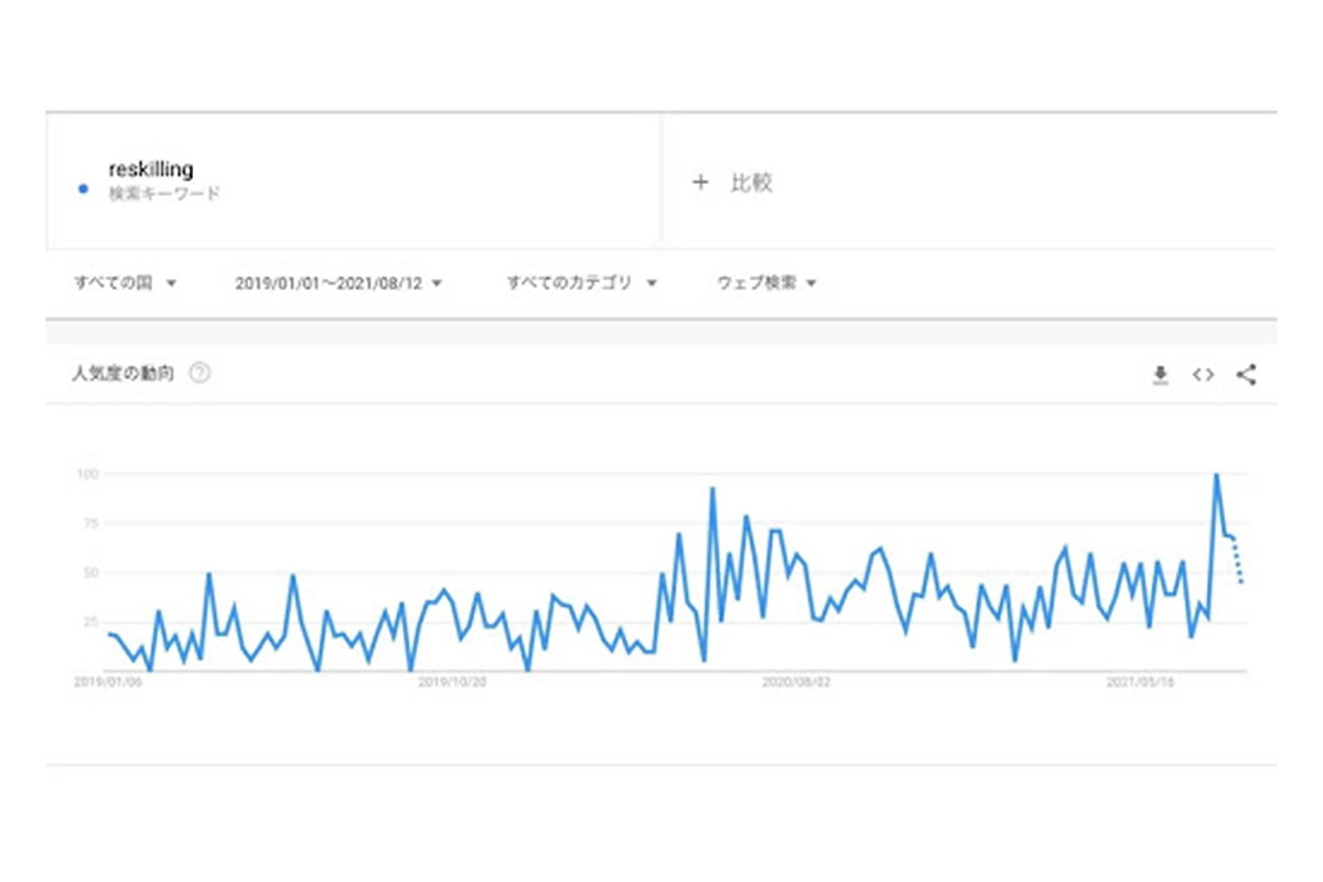 日本では「リスキリング」の知名度はまだまだ低いが、グローバルで見ると徐々に高まりつつある。2019年1月から2021年8月現在までのGoogleでの検索数をみると、「reskilling(リスキリング)」というキーワードの検索数が伸びていることがわかる。